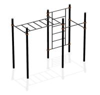 Конструкция включает в себя шведскую стенку, прямой рукоход и два разноуровневых турника. Актуальная для установки на спортивных площадках, во дворе многоквартирного дома, в санатории.